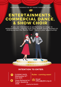 The NFYFC Entertainment Finals will be held on Saturday/Sunday April 2026 (date tbc) at venue to be confirmed. The NFYFC Commercial Dance and Show Choir finals are planned for Saturday 4th July 2026 at Staffordshire Showground.